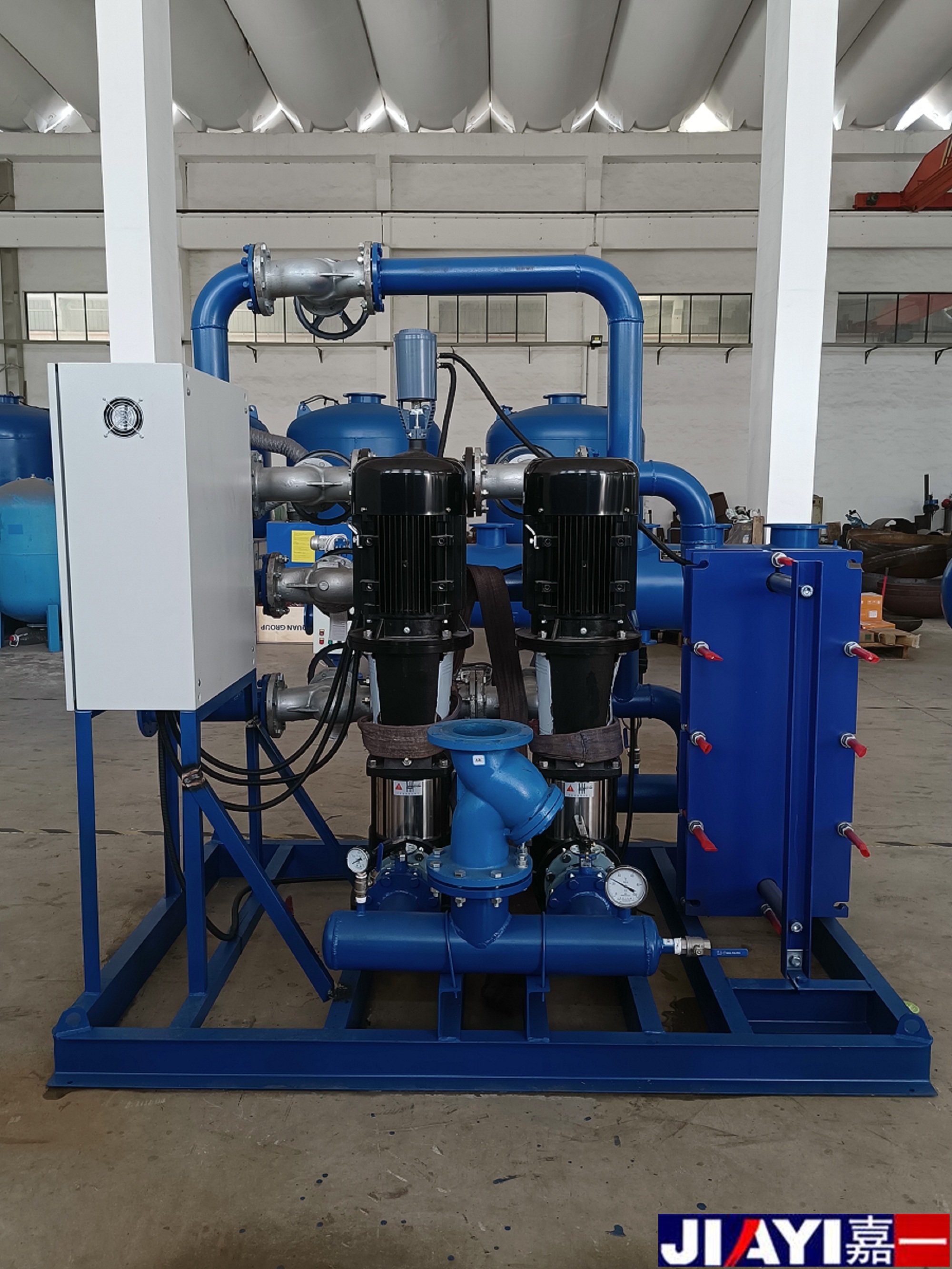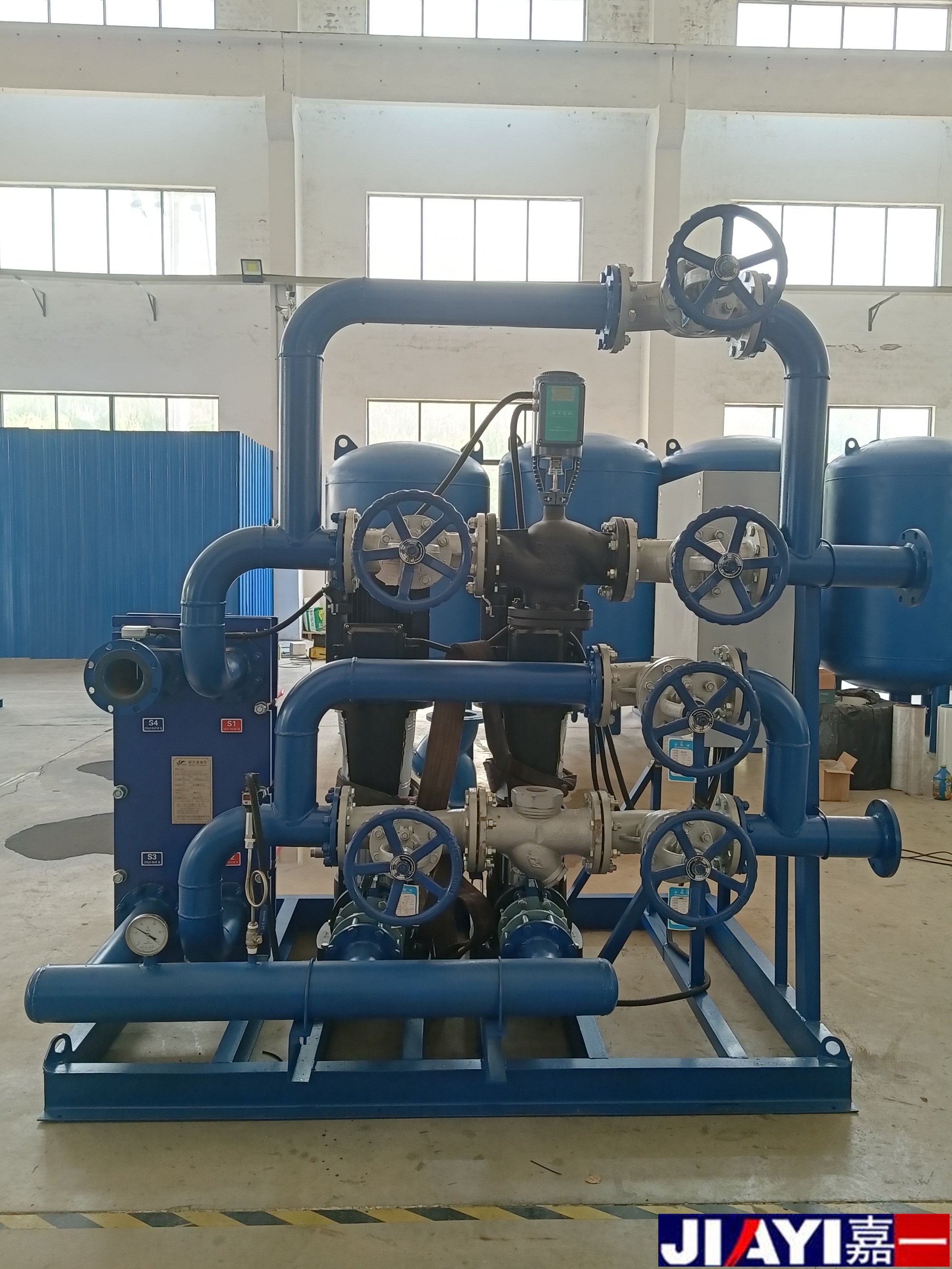 板式換熱機組,為換熱機組的一種型號,其特點是采用板式換熱器,在相同壓力損失情況下,其傳熱系數比管式換熱器高3-5倍,占地面積為管式換熱器的三分之一,熱回收率高。設備由板式換熱器、智能溫控裝置、智能電控裝置、循環泵、補水泵、穩壓膨脹水箱、補(凝)水箱、過濾器、閥門、儀表、傳感器、配管底座等組成。