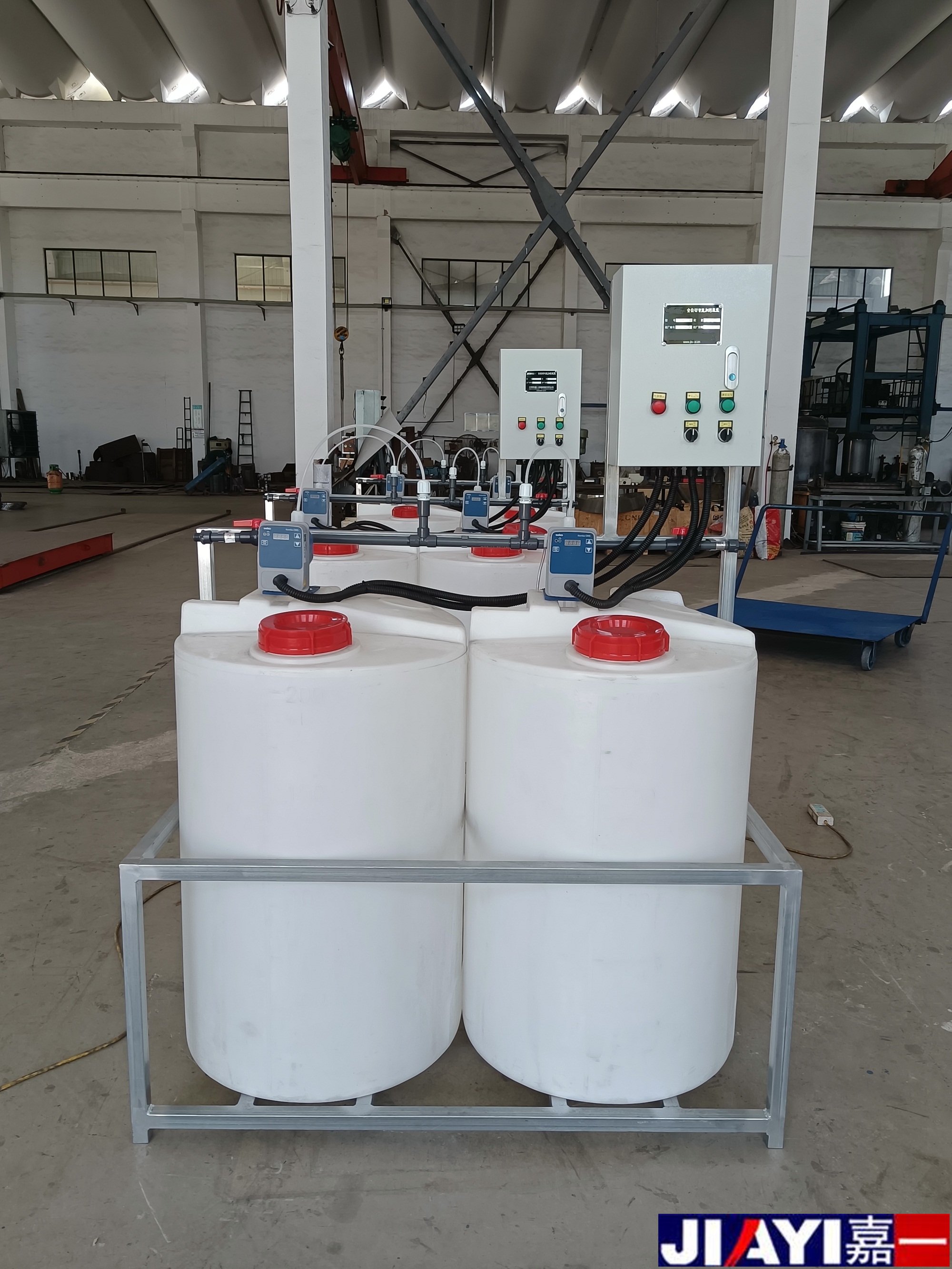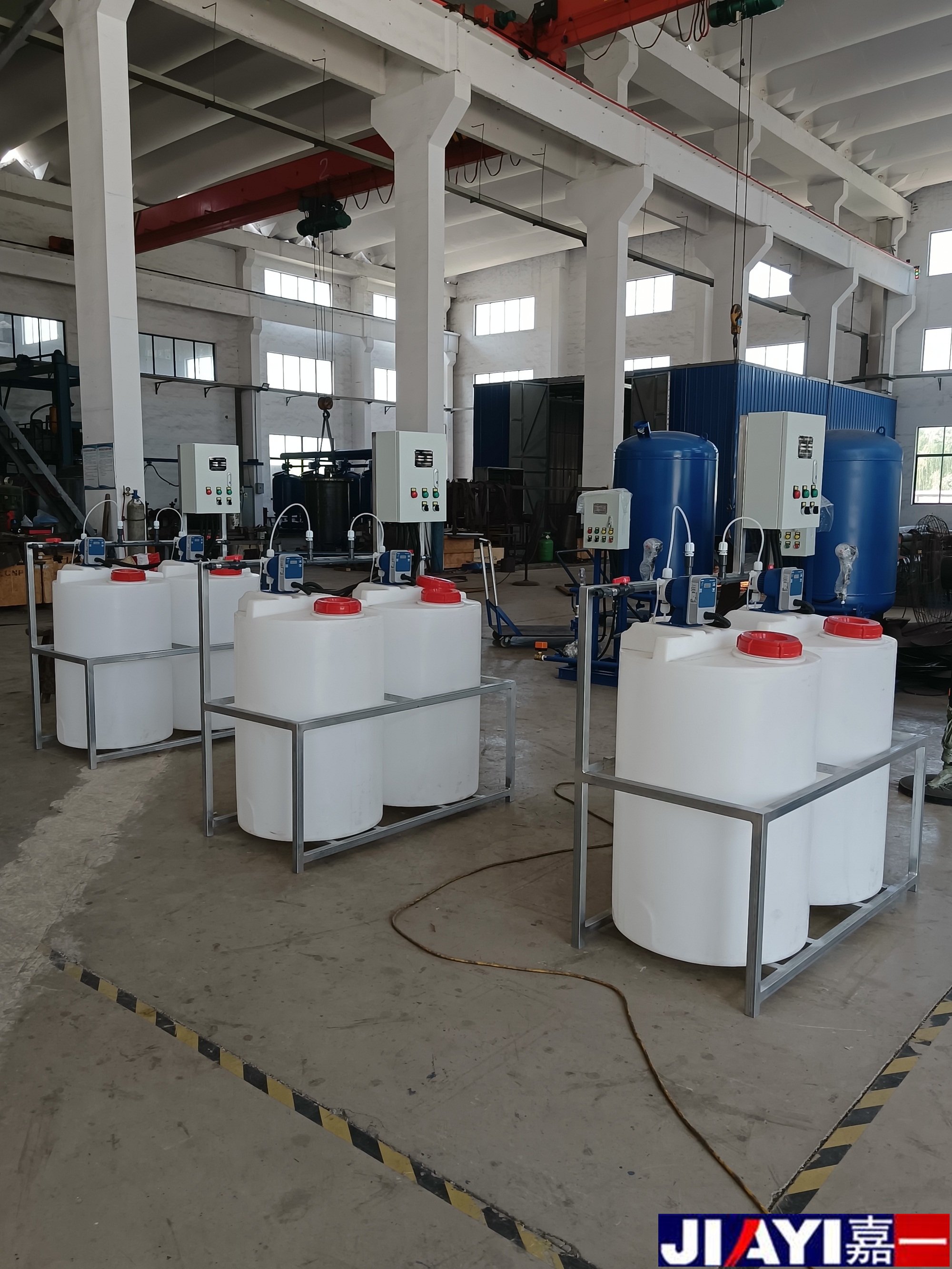 全自動加藥裝置采用時間程序控制,此控制方式無需儀表的支持,首先根據系統的運轉需要設定自動加藥的周期、加藥量、加藥時間和加藥頻率。在以后的系統運轉過程中,到加藥周期,計量泵自動打開加藥,加到規定的時間計量泵關閉;到排污周期,計量泵停止加藥,排到規定的時間后,計量泵繼續開啟,補充排污損失掉的藥劑,把系統的含藥量維持在正常的水平、加到規定的時間計量泵關閉。