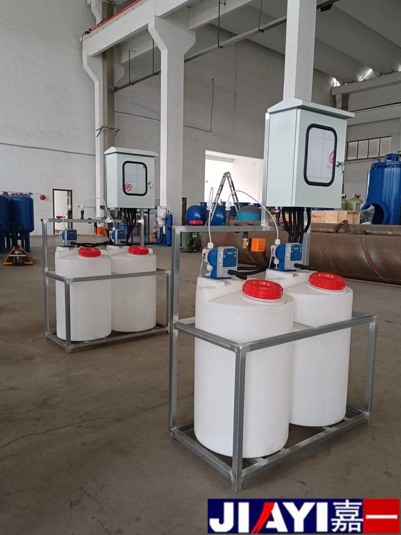 全自動加藥裝置采用時間程序控制,此控制方式無需儀表的支持,首先根據(jù)系統(tǒng)的運轉(zhuǎn)需要設(shè)定自動加藥的周期、加藥量、加藥時間和加藥頻率。在以后的系統(tǒng)運轉(zhuǎn)過程中,到加藥周期,計量泵自動打開加藥,加到規(guī)定的時間計量泵關(guān)閉;到排污周期,計量泵停止加藥,排到規(guī)定的時間后,計量泵繼續(xù)開啟,補充排污損失掉的藥劑,把系統(tǒng)的含藥量維持在正常的水平、加到規(guī)定的時間計量泵關(guān)閉。