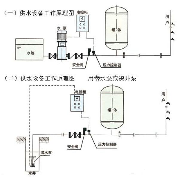 4、當(dāng)用水量等于零時(shí),系統(tǒng)壓力保持不變的情況下,水泵停止工作,依靠罐內(nèi)壓力繼續(xù)供水,維持系統(tǒng)壓力,達(dá)到了節(jié)省電能作用。