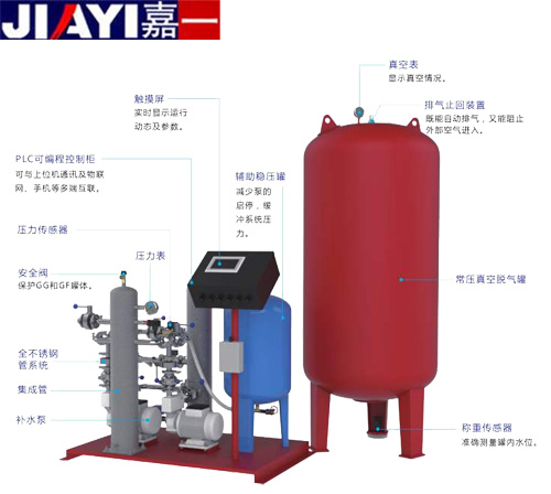采用創(chuàng)新技術(shù),將系統(tǒng)的膨脹水量、軟化水補(bǔ)水都貯存在膨脹器中,補(bǔ)水泵可直接從膨脹器中抽水,因此系統(tǒng)可不另設(shè)軟化水箱,進(jìn)一步節(jié)能投資、節(jié)約占地。