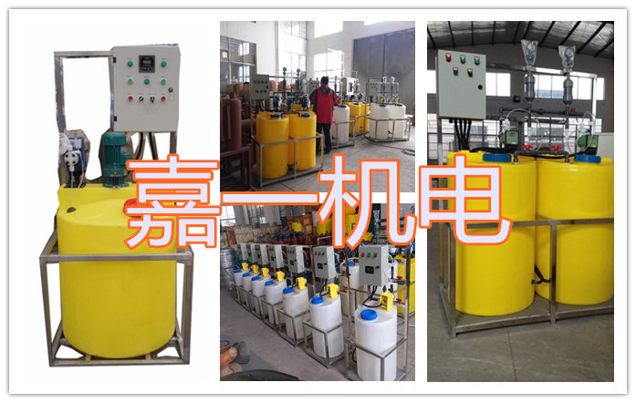 一體化加藥裝置主要由攪拌裝置及儲藥裝置等組成,工作時,將混凝劑和水分別按所需配置濃度的量置于攪拌罐中,經(jīng)葉片攪拌均勻后,再使用。本設(shè)備通過設(shè)置分層攪拌裝置,利用經(jīng)污水處理站處理后的中水或自來水為動力進行攪拌的加藥裝置。該攪拌裝置包括攪拌箱體、自來水噴嘴、液位開關(guān),進水電磁閥。