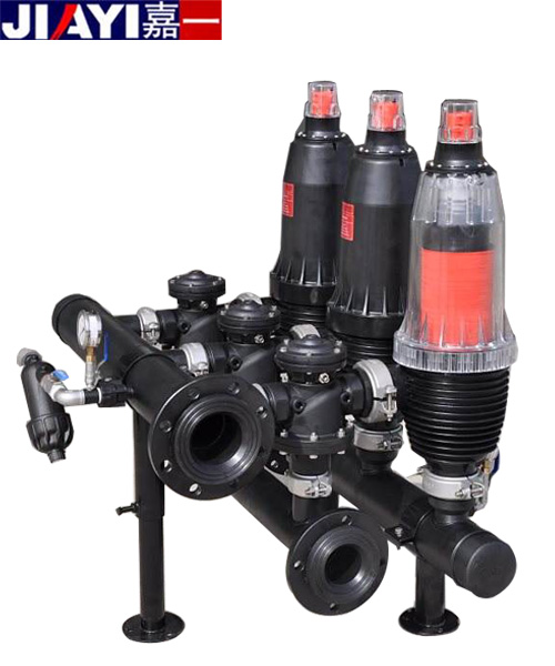 盤式過濾單元由增強聚酰胺塑料成形制造,防腐耐磨,可承受工作壓力1MPa,過濾盤材質為聚丙烯塑料EPDM密,進出水及排水管路有碳鋼聚酯涂襯、工程塑料和不銹鋼三種;閥門有塑料閥或金屬閥;系統配套提供多功能控制盤。