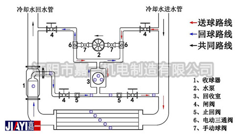 經(jīng)優(yōu)化設計,膠球不經(jīng)過水泵葉輪,杜絕水泵葉輪旋轉對膠球的損傷。收球專門設置收球泵,與其他同類設備相比收球率達到 ,其他方式不能保證收球率 。發(fā)球進出水口都在冷凝器進水端,收球進水出口都在冷凝器出水端,對冷卻水溫度沒有影響,保證冷卻效果,與同類產(chǎn)品相比節(jié)能。采用水流開關對水泵啟停進行控制,防止水泵無水運轉,保護水泵。膠球經(jīng)過管路采用PVC電動球閥和PVC管,內(nèi)壁光滑,減小膠球運動阻礙,也不會刮傷或夾傷膠球。全自動電路控制,可設定每次清洗時間和次數(shù)。