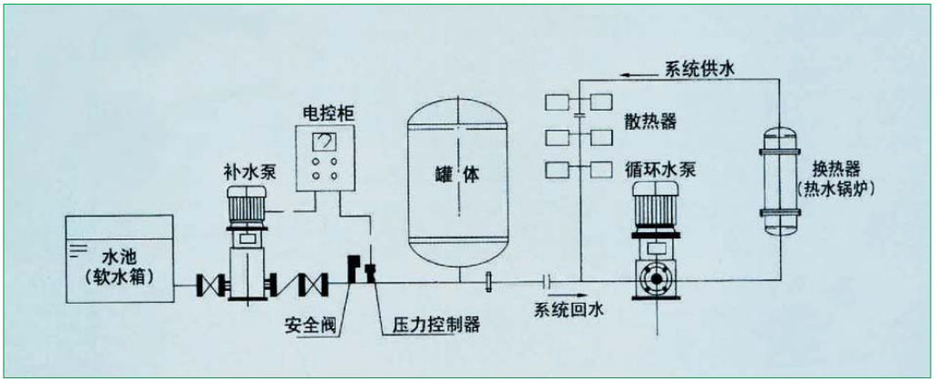 常壓定壓補水裝置設(shè)備采用系統(tǒng)靜壓作為膨脹水箱內(nèi)的設(shè)計初始壓力水頭,采用保證系統(tǒng)內(nèi)熱水不汽化的壓力作為膨脹水箱內(nèi)動行終端壓力水頭。初始運行時首先啟動補水泵向系統(tǒng)及氣壓罐內(nèi)的水室中充水,系統(tǒng)充滿后多余的水被擠進膠囊內(nèi)。因為水的不可壓縮性,隨著水量的不斷增加,水室的體積也不斷的擴大而壓縮氣室,罐內(nèi)的壓力也不斷的升高。當(dāng)壓力達(dá)到設(shè)計壓力時,通過壓力控制器使補水泵關(guān)閉。當(dāng)系統(tǒng)內(nèi)的水受熱膨脹使系統(tǒng)壓力升高超過設(shè)計壓力時,多余的水通過安全閥排至補水箱循環(huán)使用,當(dāng)系統(tǒng)中的水由于泄露或溫度下降而體積縮小,系統(tǒng)壓力降低時,膠囊中的水被不斷壓入管網(wǎng)補充系統(tǒng)的壓降損失,當(dāng)系統(tǒng)壓力至設(shè)計允許的最低壓力時,通過壓力控制器使補水泵重新啟動向管網(wǎng)及氣壓罐內(nèi)補水,如此周而復(fù)始。