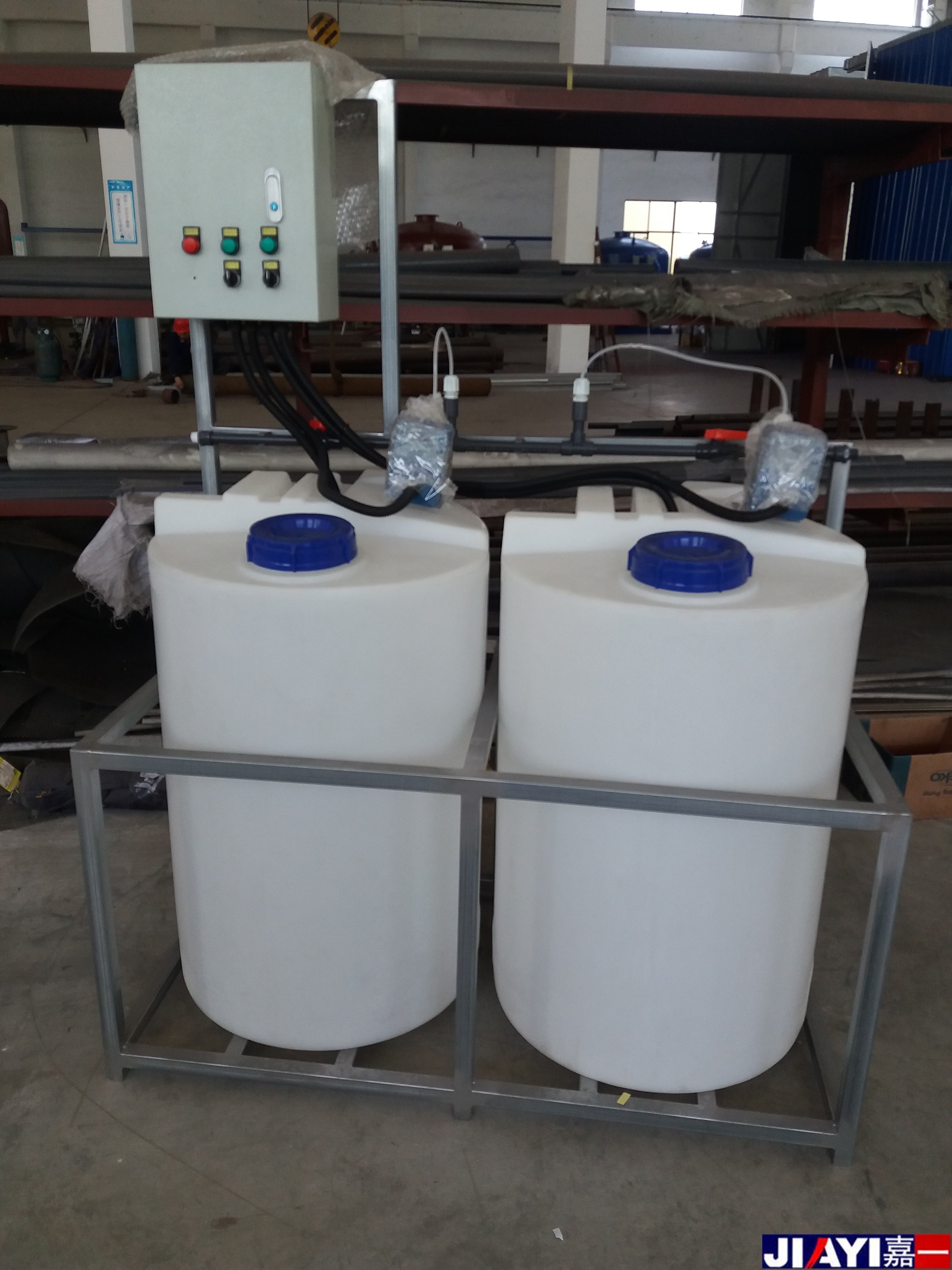 全自動加藥裝置采用時間程序控制,此控制方式無需儀表的支持,首先根據系統的運轉需要設定自動加藥的周期、加藥量、加藥時間和加藥頻率。在以后的系統運轉過程中,到加藥周期,計量泵自動打開加藥,加到規定的時間計量泵關閉;到排污周期,計量泵停止加藥,排到規定的時間后,計量泵繼續開啟,補充排污損失掉的藥劑,把系統的含藥量維持在正常的水平、加到規定的時間計量泵關閉。