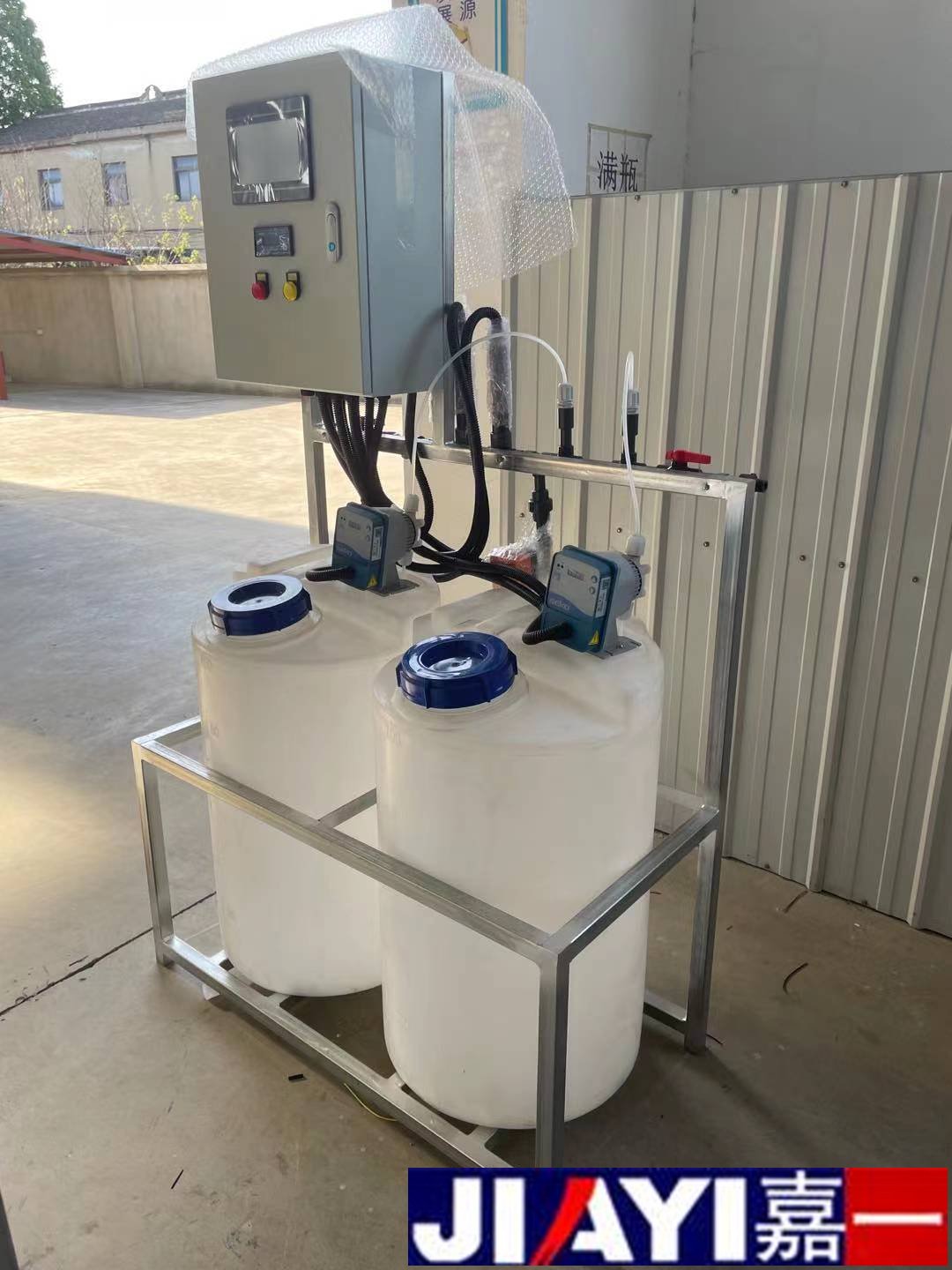 全自動加藥裝置采用時間程序控制,此控制方式無需儀表的支持,首先根據(jù)系統(tǒng)的運(yùn)轉(zhuǎn)需要設(shè)定自動加藥的周期、加藥量、加藥時間和加藥頻率。在以后的系統(tǒng)運(yùn)轉(zhuǎn)過程中,到加藥周期,計量泵自動打開加藥,加到規(guī)定的時間計量泵關(guān)閉;到排污周期,計量泵停止加藥,排到規(guī)定的時間后,計量泵繼續(xù)開啟,補(bǔ)充排污損失掉的藥劑,把系統(tǒng)的含藥量維持在正常的水平、加到規(guī)定的時間計量泵關(guān)閉。