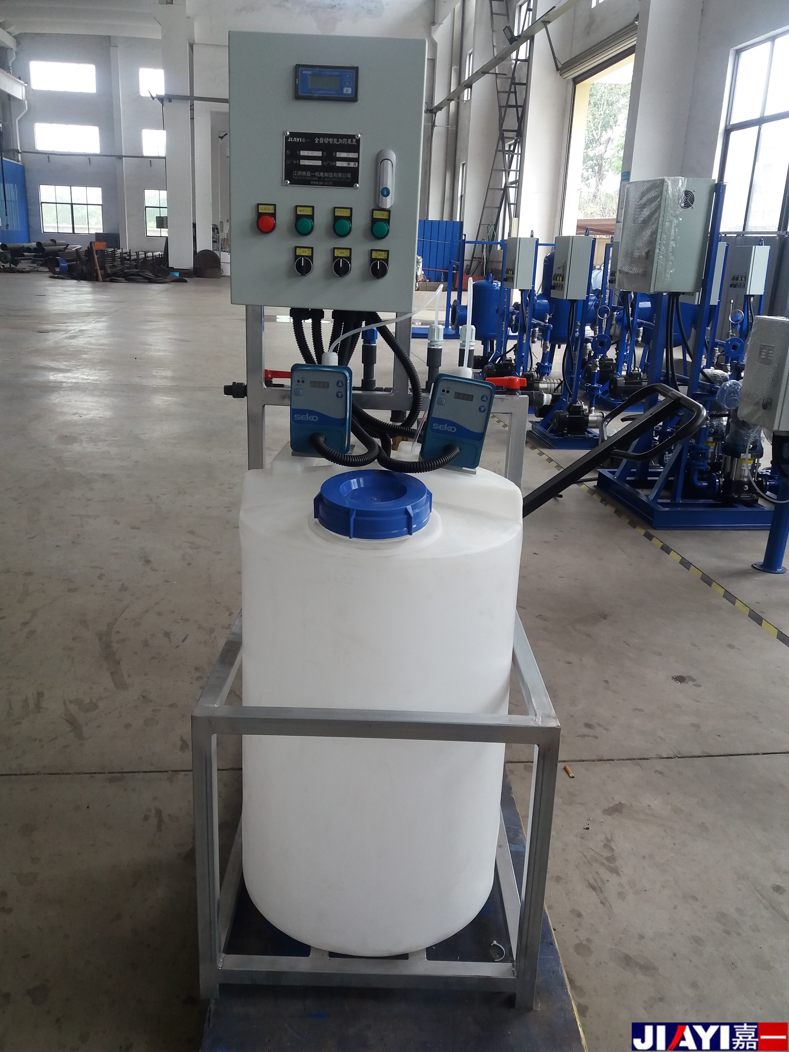 全自動加藥裝置采用時間程序控制,此控制方式無需儀表的支持,首先根據(jù)系統(tǒng)的運轉(zhuǎn)需要設(shè)定自動加藥的周期、加藥量、加藥時間和加藥頻率。在以后的系統(tǒng)運轉(zhuǎn)過程中,到加藥周期,計量泵自動打開加藥,加到規(guī)定的時間計量泵關(guān)閉;到排污周期,計量泵停止加藥,排到規(guī)定的時間后,計量泵繼續(xù)開啟,補充排污損失掉的藥劑,把系統(tǒng)的含藥量維持在正常的水平、加到規(guī)定的時間計量泵關(guān)閉。
