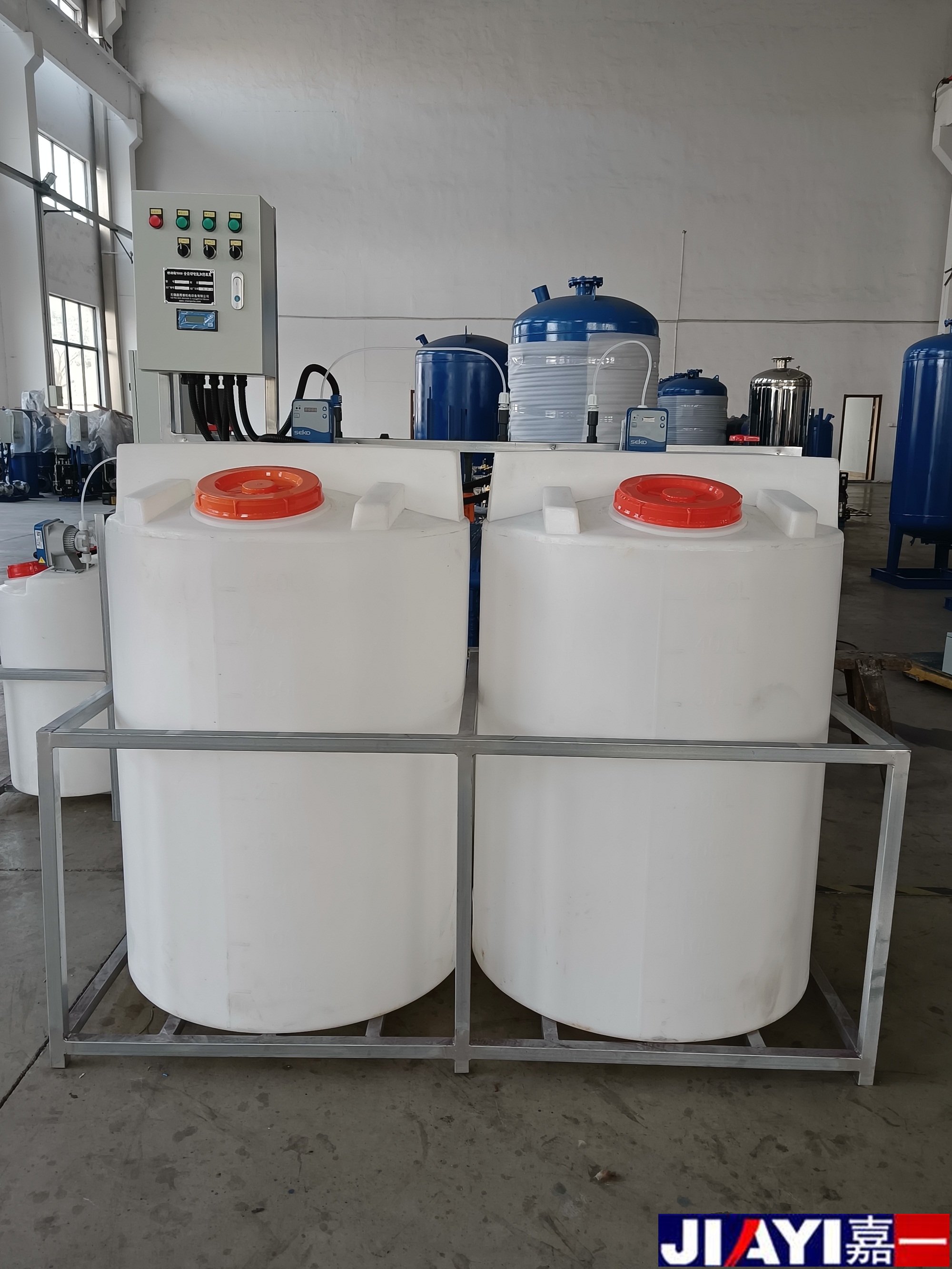 全自動加藥裝置采用時間程序控制,此控制方式無需儀表的支持,首先根據(jù)系統(tǒng)的運(yùn)轉(zhuǎn)需要設(shè)定自動加藥的周期、加藥量、加藥時間和加藥頻率。在以后的系統(tǒng)運(yùn)轉(zhuǎn)過程中,到加藥周期,計(jì)量泵自動打開加藥,加到規(guī)定的時間計(jì)量泵關(guān)閉;到排污周期,計(jì)量泵停止加藥,排到規(guī)定的時間后,計(jì)量泵繼續(xù)開啟,補(bǔ)充排污損失掉的藥劑,把系統(tǒng)的含藥量維持在正常的水平、加到規(guī)定的時間計(jì)量泵關(guān)閉。