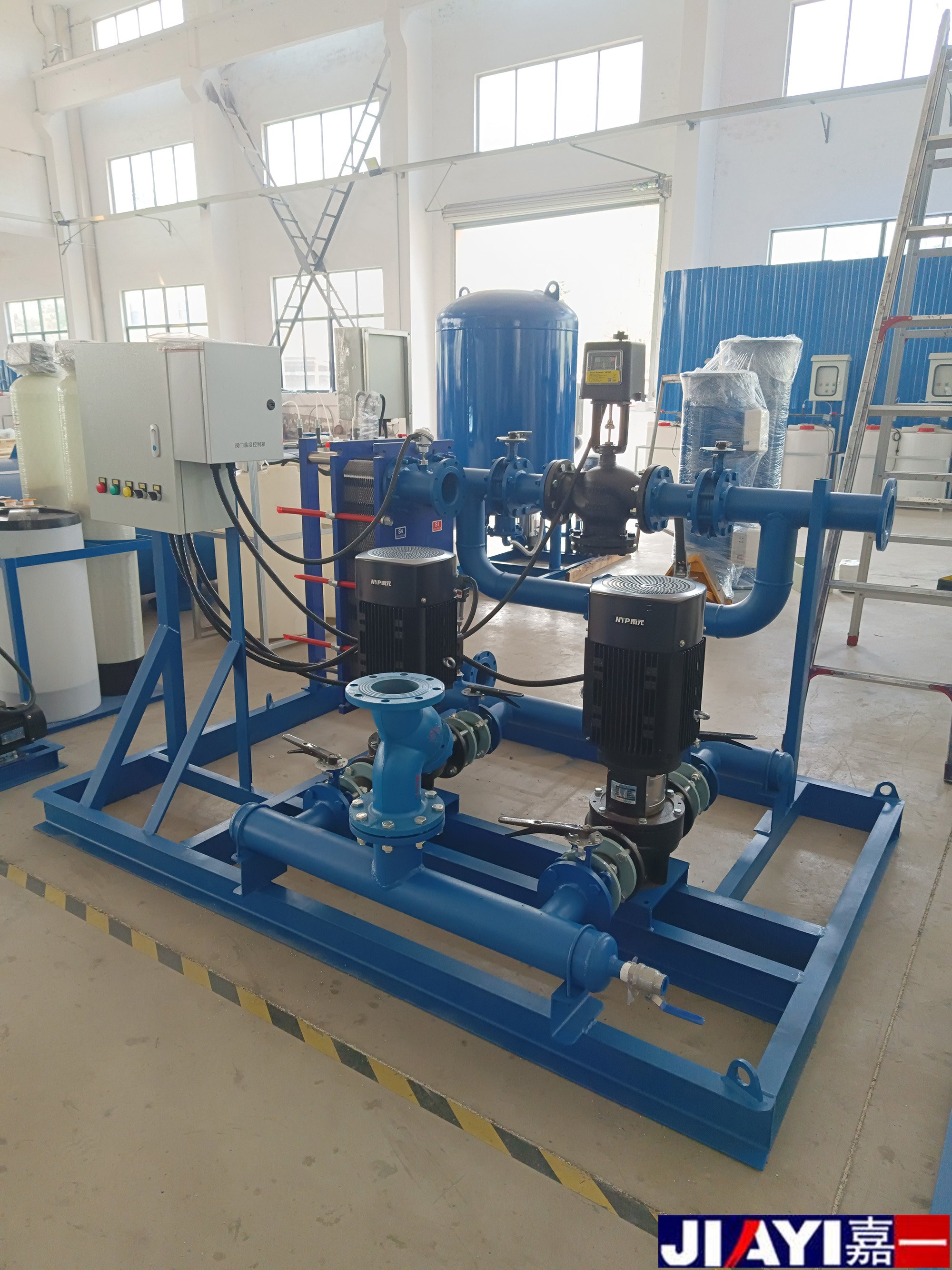 板式換熱機組,為換熱機組的一種型號,其特點是采用板式換熱器,在相同壓力損失情況下,其傳熱系數比管式換熱器高3-5倍,占地面積為管式換熱器的三分之一,熱回收率高。設備由板式換熱器、智能溫控裝置、智能電控裝置、循環泵、補水泵、穩壓膨脹水箱、補(凝)水箱、過濾器、閥門、儀表、傳感器、配管底座等組成。