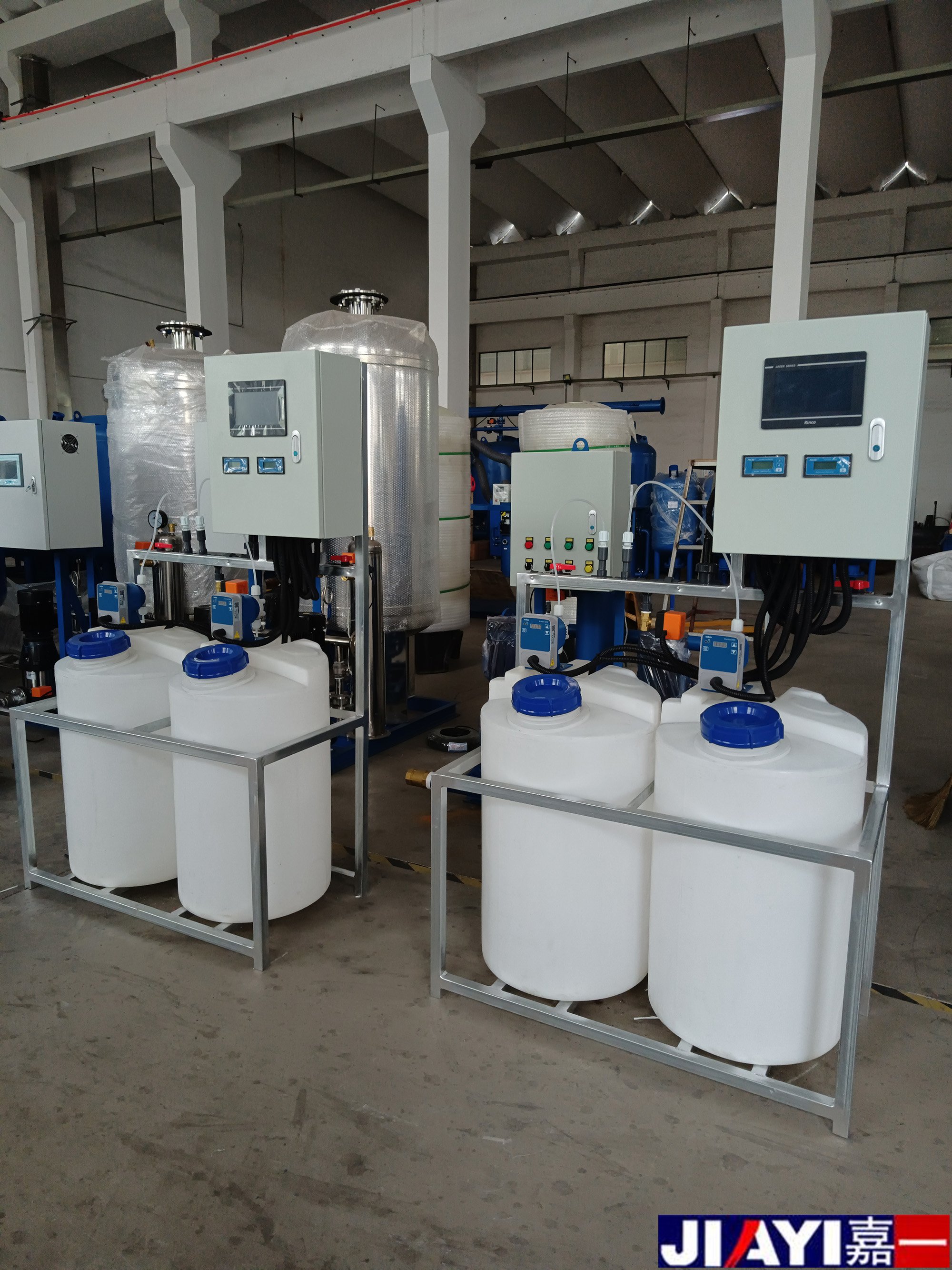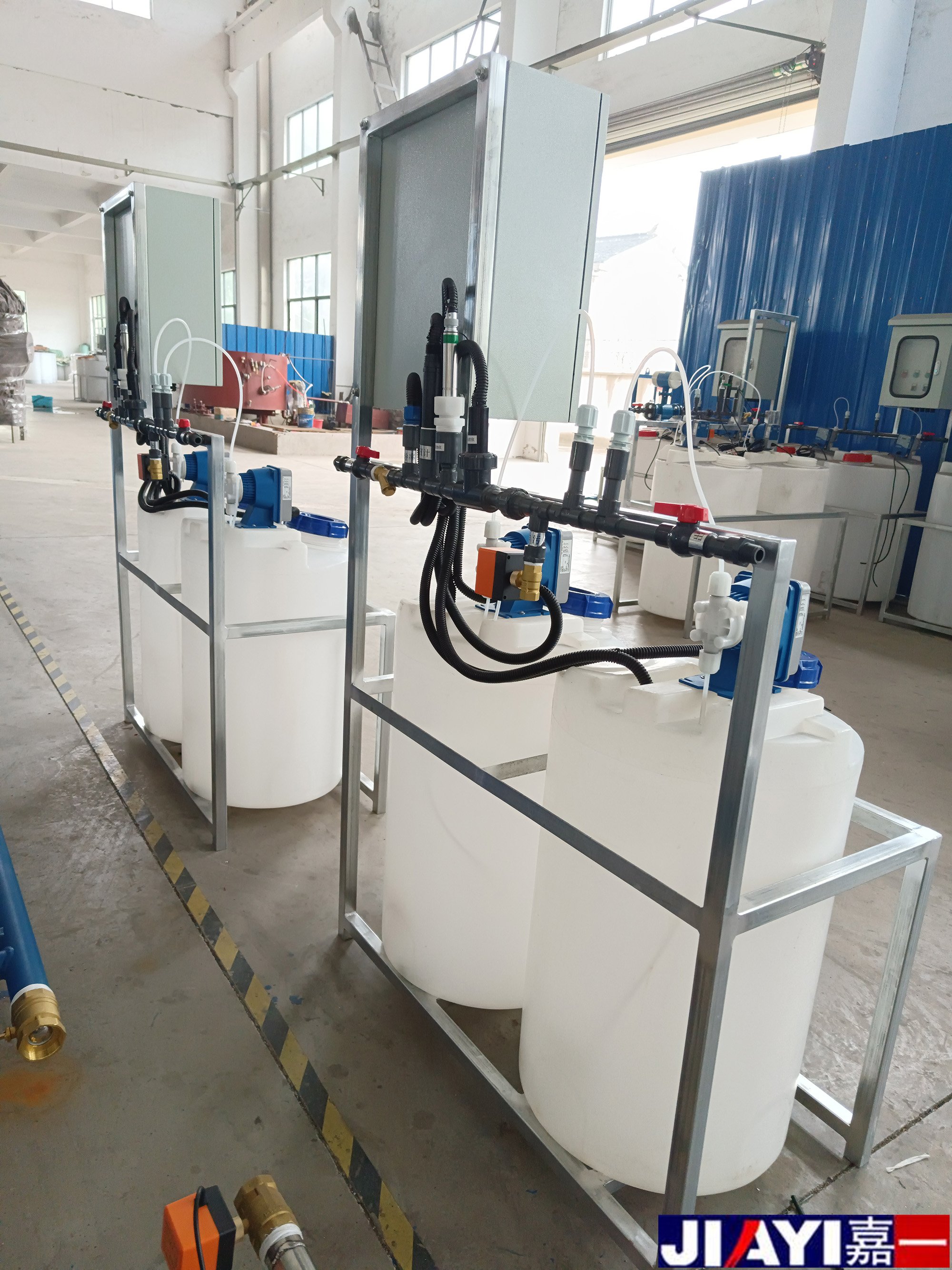 全自動加藥裝置采用時間程序控制,此控制方式無需儀表的支持,首先根據(jù)系統(tǒng)的運轉需要設定自動加藥的周期、加藥量、加藥時間和加藥頻率。在以后的系統(tǒng)運轉過程中,到加藥周期,計量泵自動打開加藥,加到規(guī)定的時間計量泵關閉;到排污周期,計量泵停止加藥,排到規(guī)定的時間后,計量泵繼續(xù)開啟,補充排污損失掉的藥劑,把系統(tǒng)的含藥量維持在正常的水平、加到規(guī)定的時間計量泵關閉。