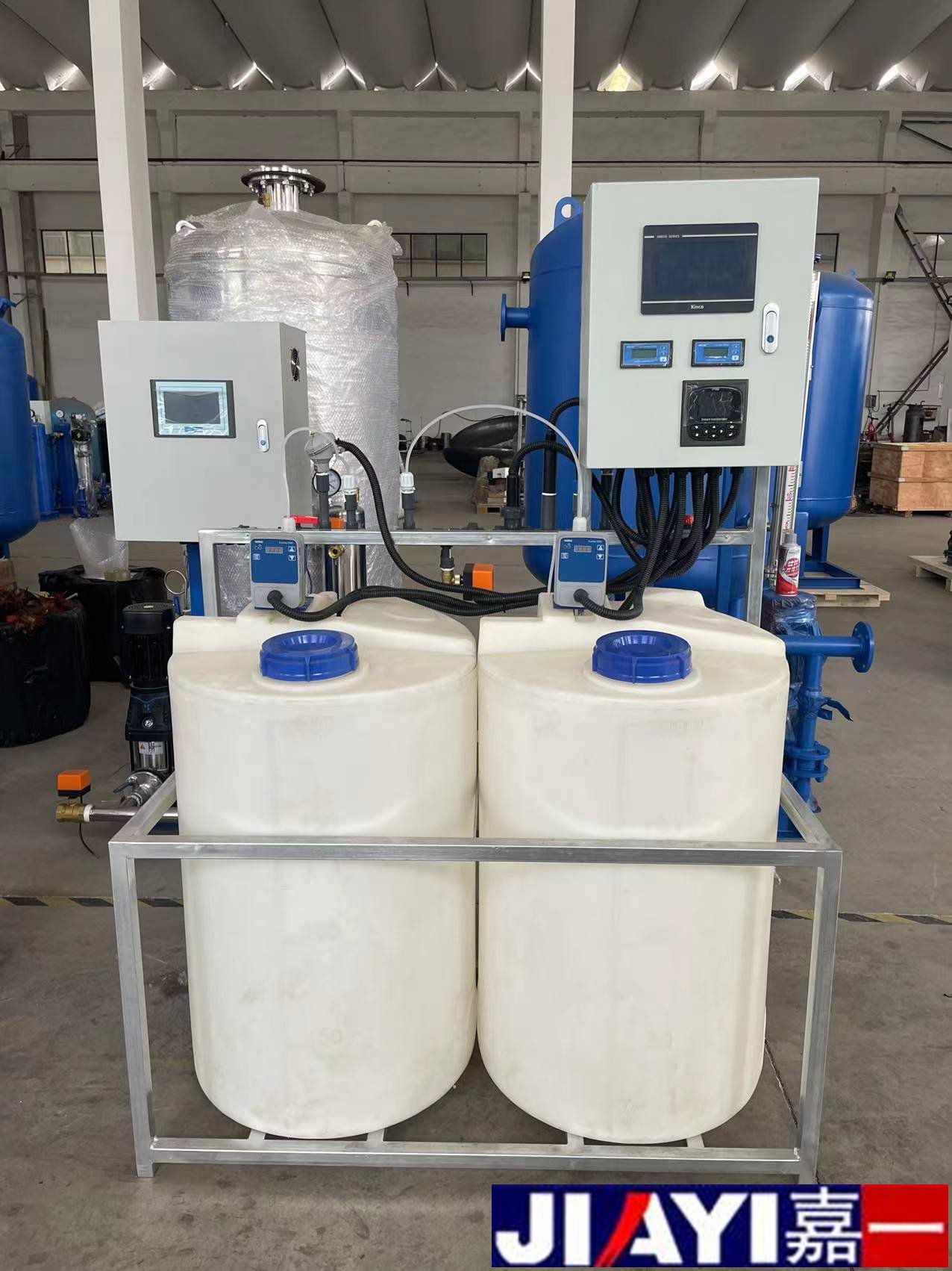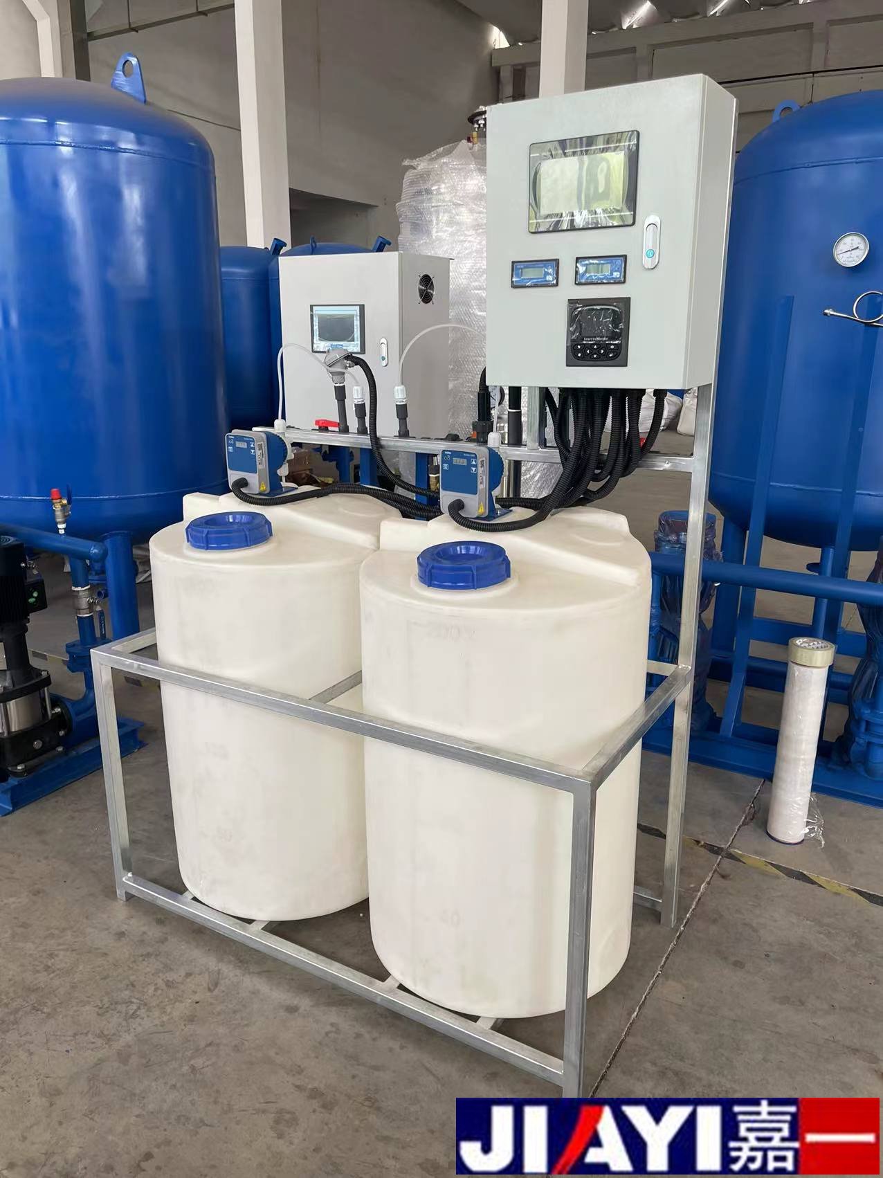 全自動加藥裝置采用時間程序控制,此控制方式無需儀表的支持,首先根據(jù)系統(tǒng)的運轉(zhuǎn)需要設(shè)定自動加藥的周期、加藥量、加藥時間和加藥頻率。在以后的系統(tǒng)運轉(zhuǎn)過程中,到加藥周期,計量泵自動打開加藥,加到規(guī)定的時間計量泵關(guān)閉;到排污周期,計量泵停止加藥,排到規(guī)定的時間后,計量泵繼續(xù)開啟,補充排污損失掉的藥劑,把系統(tǒng)的含藥量維持在正常的水平、加到規(guī)定的時間計量泵關(guān)閉。
